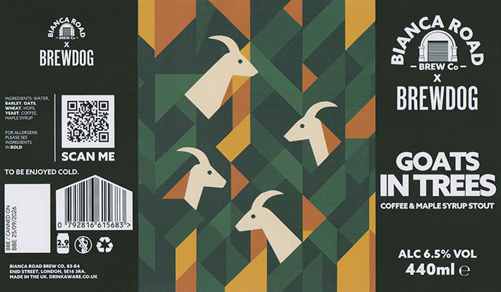 Goats In TreesCoffee & Maple Syrup StoutBB 25/09/20266 . 5 %( Collaboration With Bianca Road Brew Co. )( Brewdog Collabfest 2025 ) |