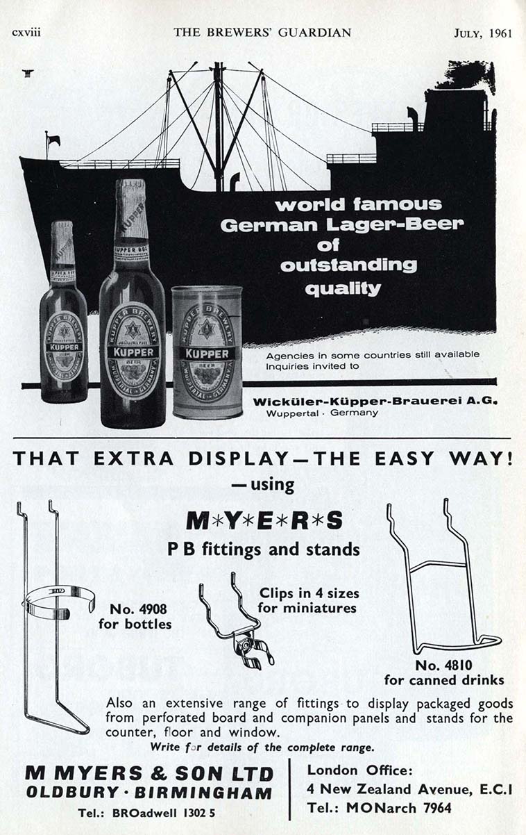 HERE WE HAVE AN ADVERT FROM THE JULY 1961 EDITION OF "THE BREWERS GUARDIAN", IT SHOWS A GERMAN ADVERT FOR A KUPPER BEER CAN THE ADVERT BELOW IS FOR DISPLAYING CANS AND BOTTLES ETC.