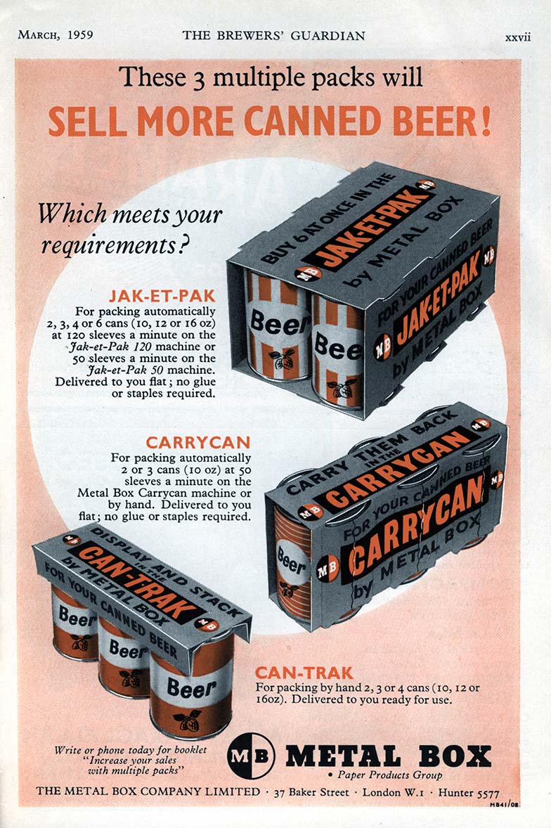 HERE WE HAVE AN ADVERT FROM THE MARCH 1959 EDITION OF "THE BREWERS GUARDIAN", IT SHOWS 3 DIFFERENT STYLES OF MULTI PACKS.