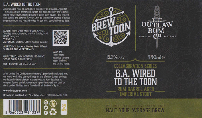 B.A. Wired To The ToonRum Barrel Aged Imperial Stout( Collaboration Series )BB 09/10/202912 . 7 %( Collaboration With The Outlaw Rum Co. )