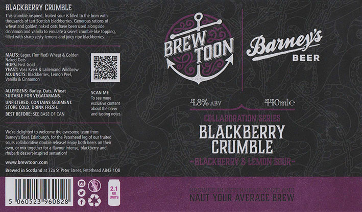 Blackberry CrumbleBlackberry & Lemon Sour( Collaboration Series )BB 14/09/20234 . 8 %( Collaboration With Barneys Beer )