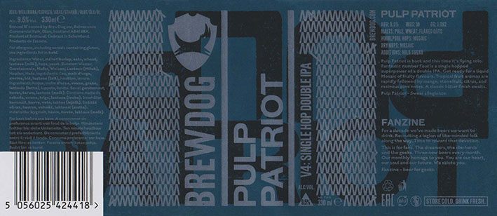 Pulp PatriotV4 - Single Hop Edition IPABrewdog Fanzine Box 25BB 07/10/20199 . 5 % |