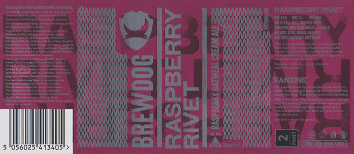 Raspberry RivetRaspberry Oatmeal Cream AleBrewdog Fanzine Box 6BB 16/09/20186 . 5 % |