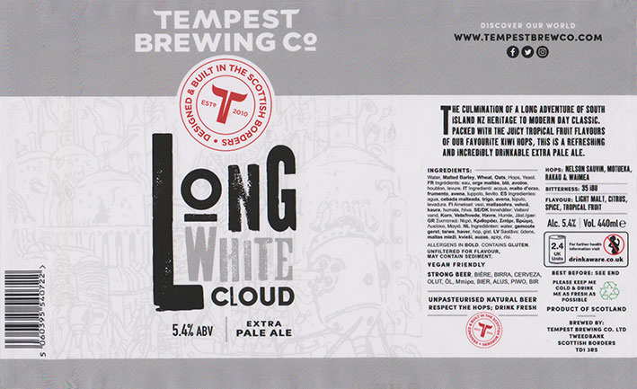 Long White CloudNZ Extra Pale AleBB 18/02/20215 . 4 % |