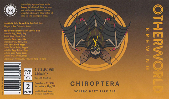 ChiropteraSolero Hazy Pale AleBB 21/04/20253 . 4 %( Collaboration with Otherworld Brewing ) |