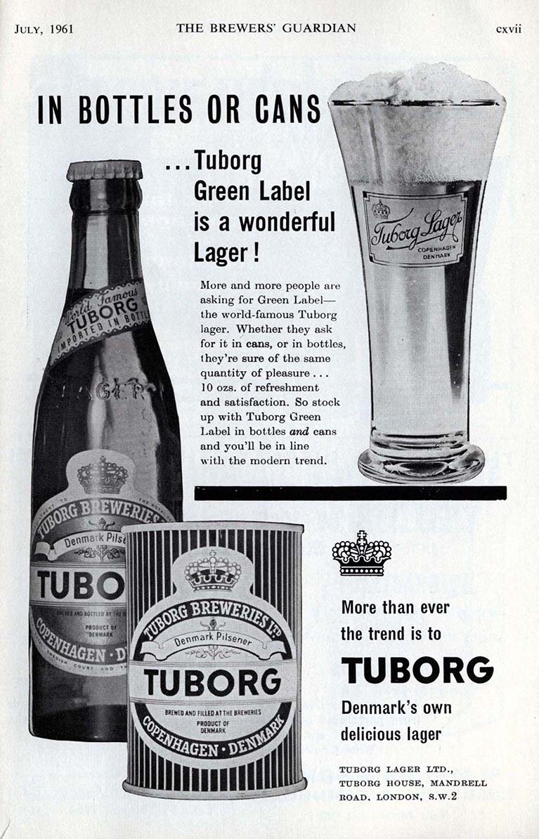 HERE WE HAVE AN ADVERT FROM THE JULY 1961 EDITION OF "THE BREWERS GUARDIAN", IT SHOWS A DANISH ADVERT FOR A TUBORG BEER CAN.
