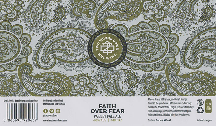 Faith Over FearPaisley Pale AleBB 15/01/20276 . 0 %( Commemorative Beer For St. MirrenWinning The 2025 Scottish League Cup ) |